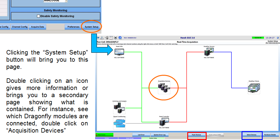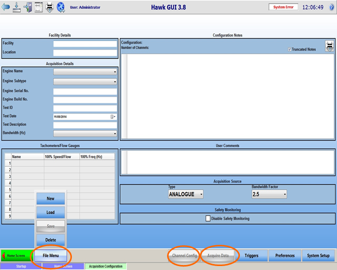 From the “Configuration” page in the Hawk Gui, select the “Acquire Data” button to configure the system.