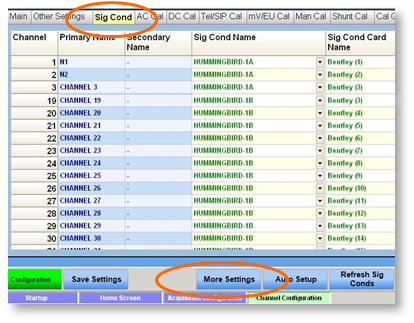 For many types of instrumentation such as microphones, accelerometers, and strain gauges, it is necessary to configure the signal conditioning for each channel. Go to the “Sig Cond” tab in the channel config to show which conditioning module is available for each channel. To change the settings, click the “More Settings” button.