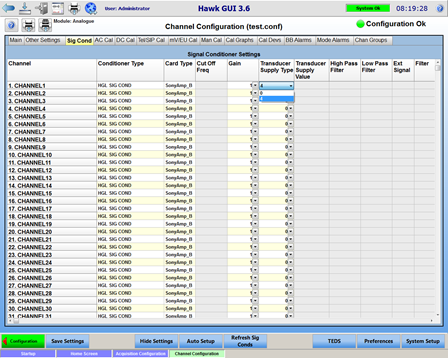 Each conditioning module supports a variety of different options. These can all be accessed in the “More Settings” page. For instance, to enable IEPE current supply, go to the “Transducer Supply Type” column and for each channel change the value to “4” which refers to 4mA of constant current required for IEPE/ICP to work.