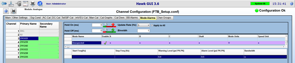 Unexpected alarms cover any frequency peak that is not captured by a mode alarm. This is configured using only amplitude levels for warning and alarm levels (see above). For more information on Mode Alarms, click here.
