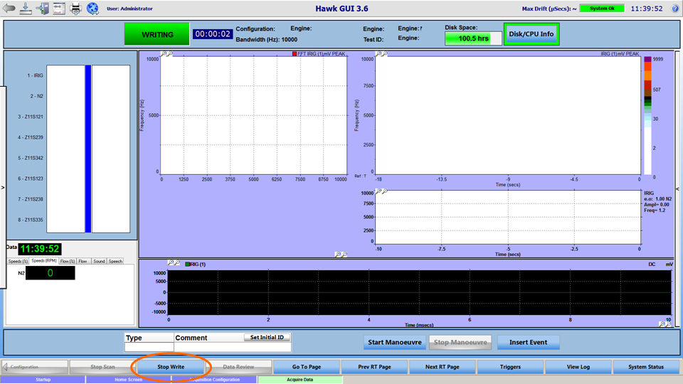To stop recording, any running manoeuvre must be stopped. Then the “Stop Write” button will be enabled. Then “Stop Scan” and “Configuration” to return the system to idle. If in “Automatic” mode, all data will be authorized and automatically transfer to the designated HDD when attached.
