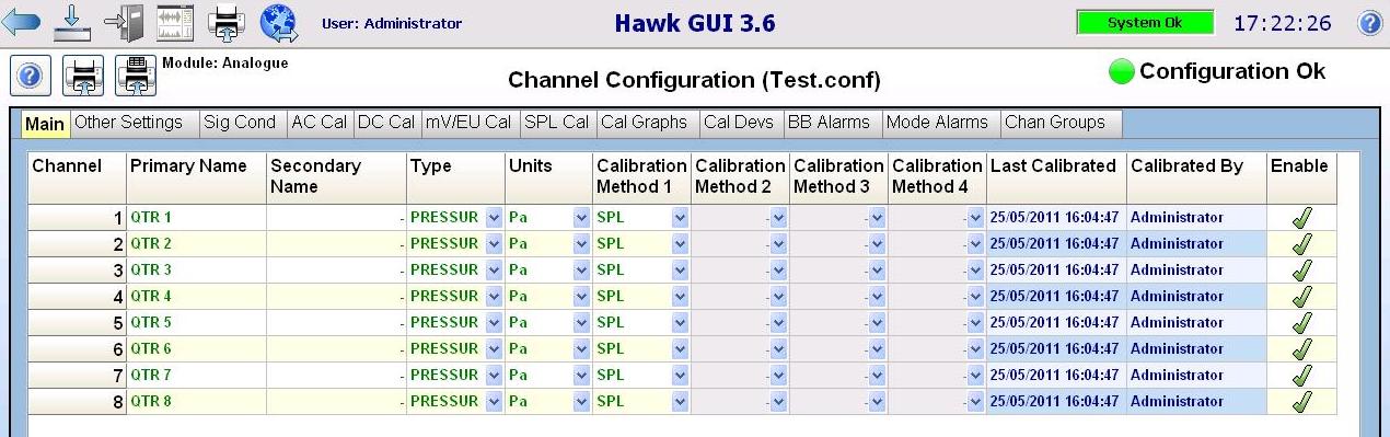 The “Channel Config” button is where all details of the current config. are stored including channel name, calibration values and alarms.