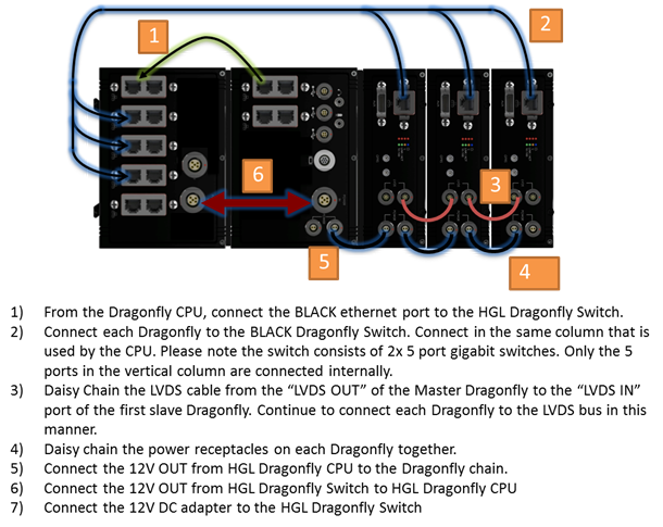 - Multiple Dragonfly units with a commercial non-POE, POE or HGL Switch module. This is ideal for larger systems but where an HGL Dragonfly CPU module is not available.