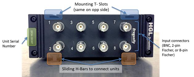 In the stackable conditioning version the Dragonfly is provided with Fischer 8-pin analogue input connectors which allow all the functions of the conditioning to be used through physical wiring connections and software.