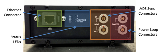 The LVDS ports are labelled IN and OUT, this is important as LVDS is uni-directional. Care must be taken when setting up multiple Dragonfly units that the correct ports are used.