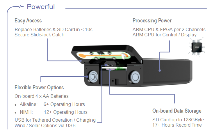 Pegasus also includes on-board storage, using SD card technology, up to 128 GBytes which represents 18 hours of recording on 5 channels at 80kHz bandwidth. A USB connection provides the ability to operate in tethered mode when attached to a PC; data captured on the SD card can be uploaded quickly if required.