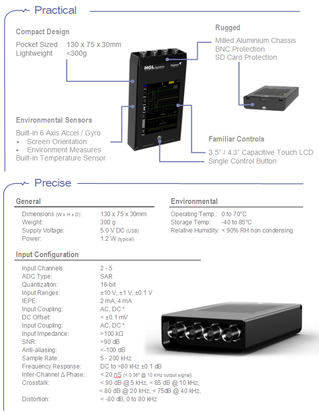 Pegasus represents the ultimate in handheld / portable measurement equipment. Within its ultra-compact chassis it provides between 2 and 5 analogue inputs each with Voltage and IEPE conditioning. Each channel is supported by a separate ADC allowing truly synchronous 16-bit acquisition up to 80kHz bandwidth, this is unheard of in a unit of this size.