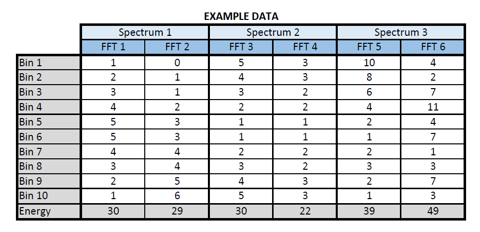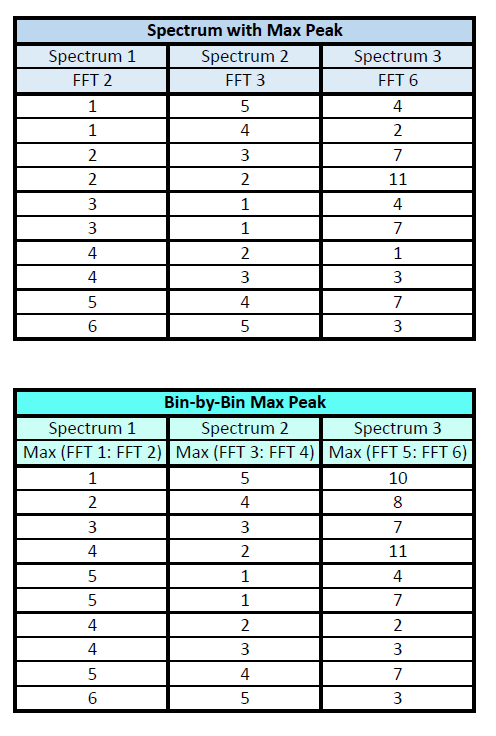 Below is a basic example of data and its results based on the processing type selected. In this example each spectrum is made up of 2 FFT's with 10 bins.