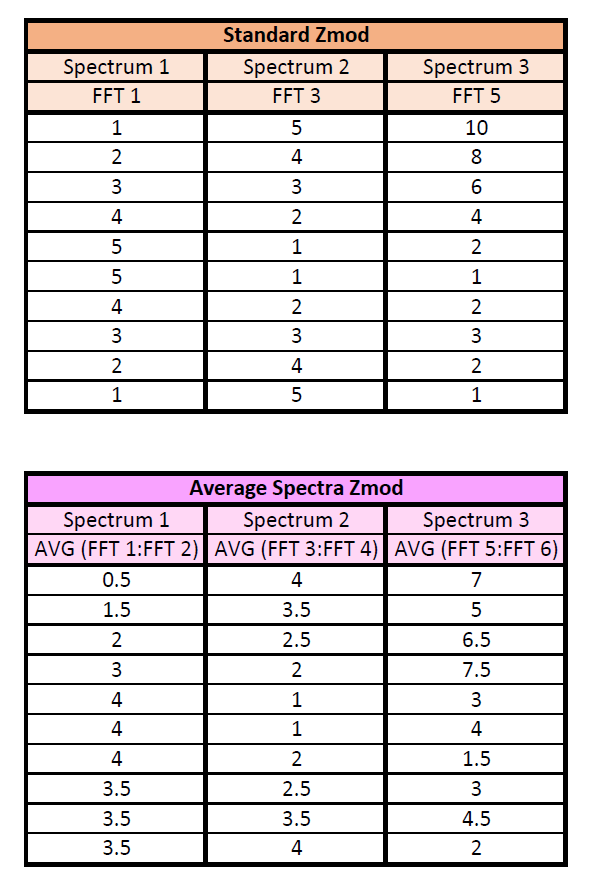 The resulting ZMod plot is made up of 360 spectra along the x-axis and 410 frequency bins along the y-axis. The way in which the 360 spectra are chosen/constructed depends on the analysis type chosen. The differences of these analysis types are explained and an example set of data is given along with graphs of the results