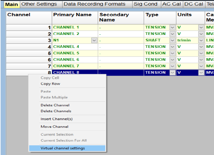 In the example below, we have a single Hawk attached to a single dragonfly device (channel 1 to 8). The user may click on any channel, in any column, and select the “Virtual channel settings” option.