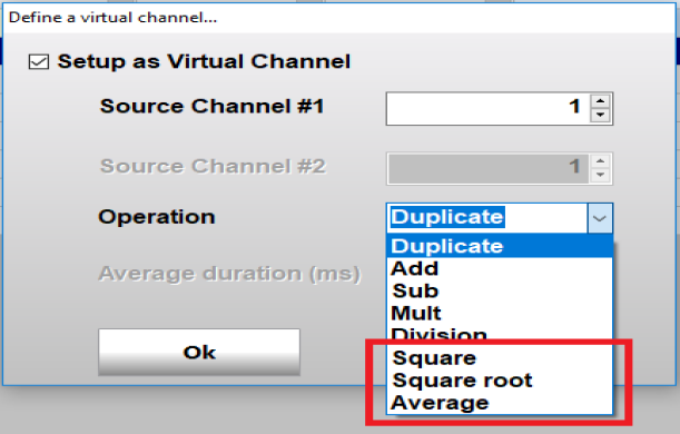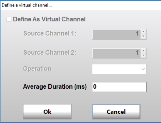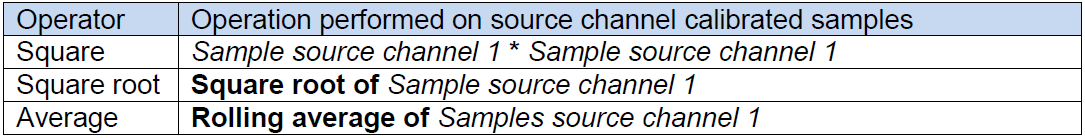 For the square root operator, if the sample of the source channel is < 0, this is an invalid operation, and the resulting sample for the virtual channel will be set to 0. The average operator will perform a rolling average of the samples of the source channel. The user will define the average duration in milliseconds, which will be converted to a number of samples based on the sample rate of the source channel.