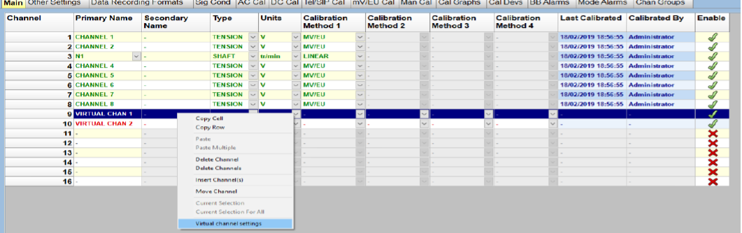 The additional 16 channels, not being attached to any hardware, may be enabled and defined as virtual channels. The user will give them a name, like any regular channels. The other channel information may not need to be filled in; this will depend on the type of operation. In our example, two virtual channels have been named and enabled, channel 9 and 10.