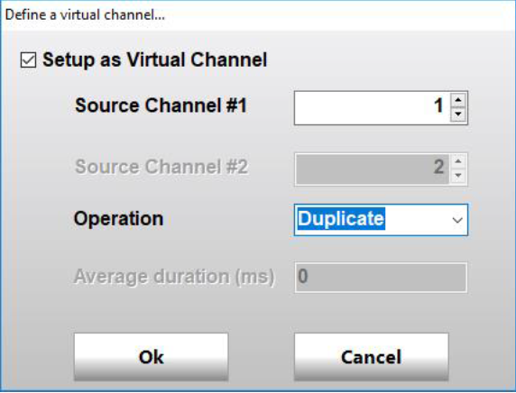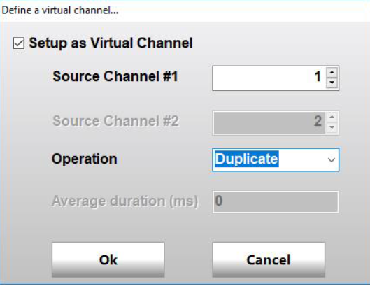The dialog below shows how to setup channel 9 as the duplicate of channel 1. Note that the average duration setting is not applicable with this operator. In fact, the average duration setting is only applicable if “Average” operator is selected.