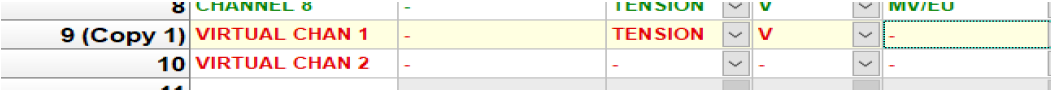 User may validate the choice by clicking on the Ok button. Channel 9 will now be displayed as being the copy of channel number 1. User will then need to define the other fields for that channel, including calibration method, just like any regular channel. In our example, channel 9 is not fully setup, and is therefore displayed in red. So is channel 10, for which we have not defined yet the operator and operands.