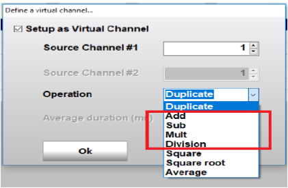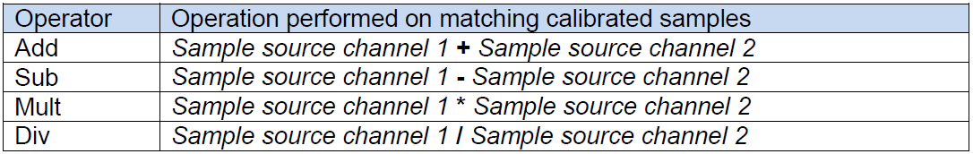 For “Add” and “Sub”, both source channels must have the same channel type and acquisition unit, and the resulting virtual channel will share the same channel type and units than its sources. For “Mult” and “Div”, there is not such a constraint, and the user will define the channel type and units of the virtual channel. For the “Div” operator, if a sample of source channel 2 is 0, the operation is invalid, and the resulting sample for the virtual channel will bet set to 0.