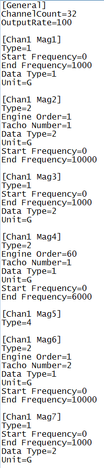 DAS Output will process data based on the setup file which will be saved to disk as "ProcSettings.ini". If a setup file is not sent, then the ProcSettings.ini can be created by hand. An example channel is shown on the right.