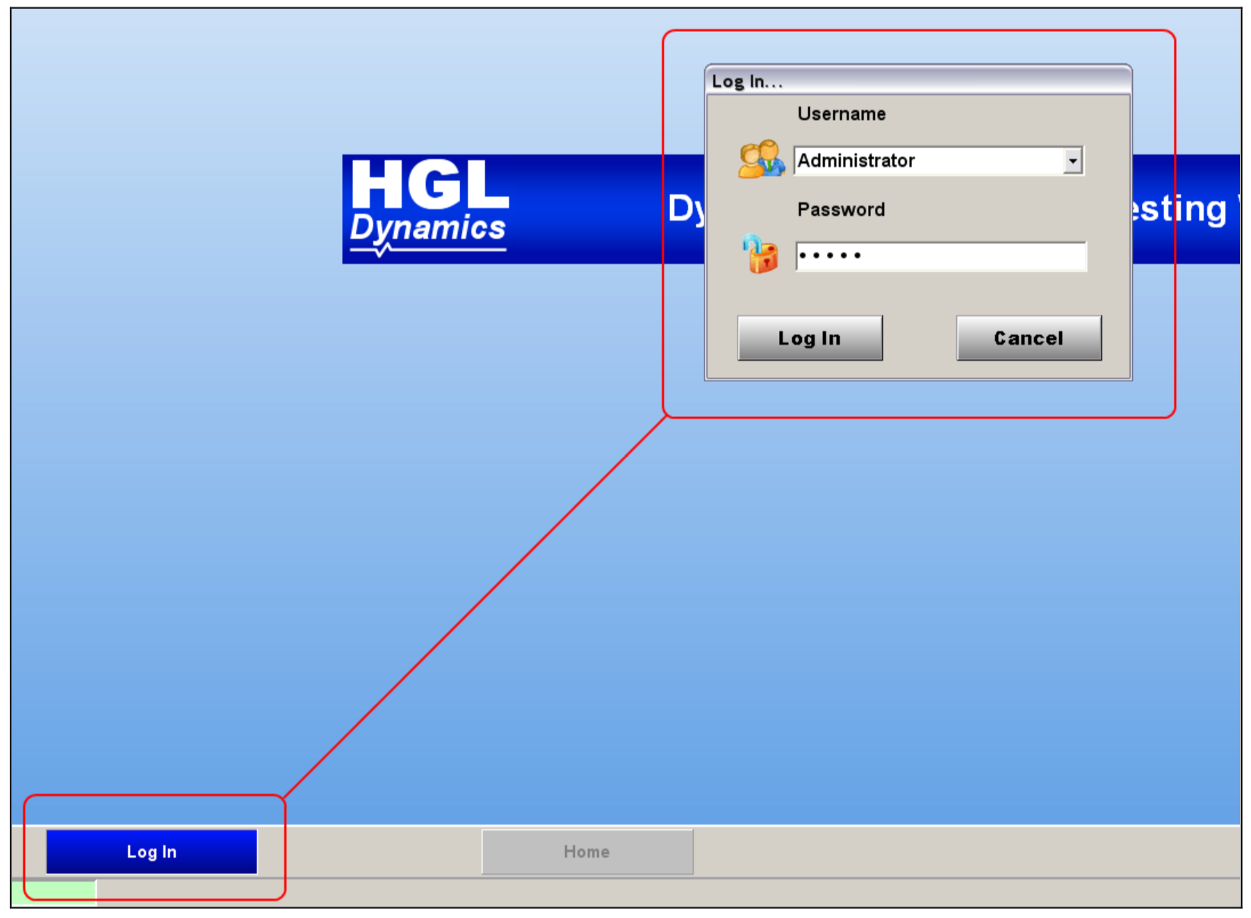 The screen shots below show the initial navigation of the GUI upon start-up. The user can Log In to the system by entering a user name and password to proceed to the Home Screen.