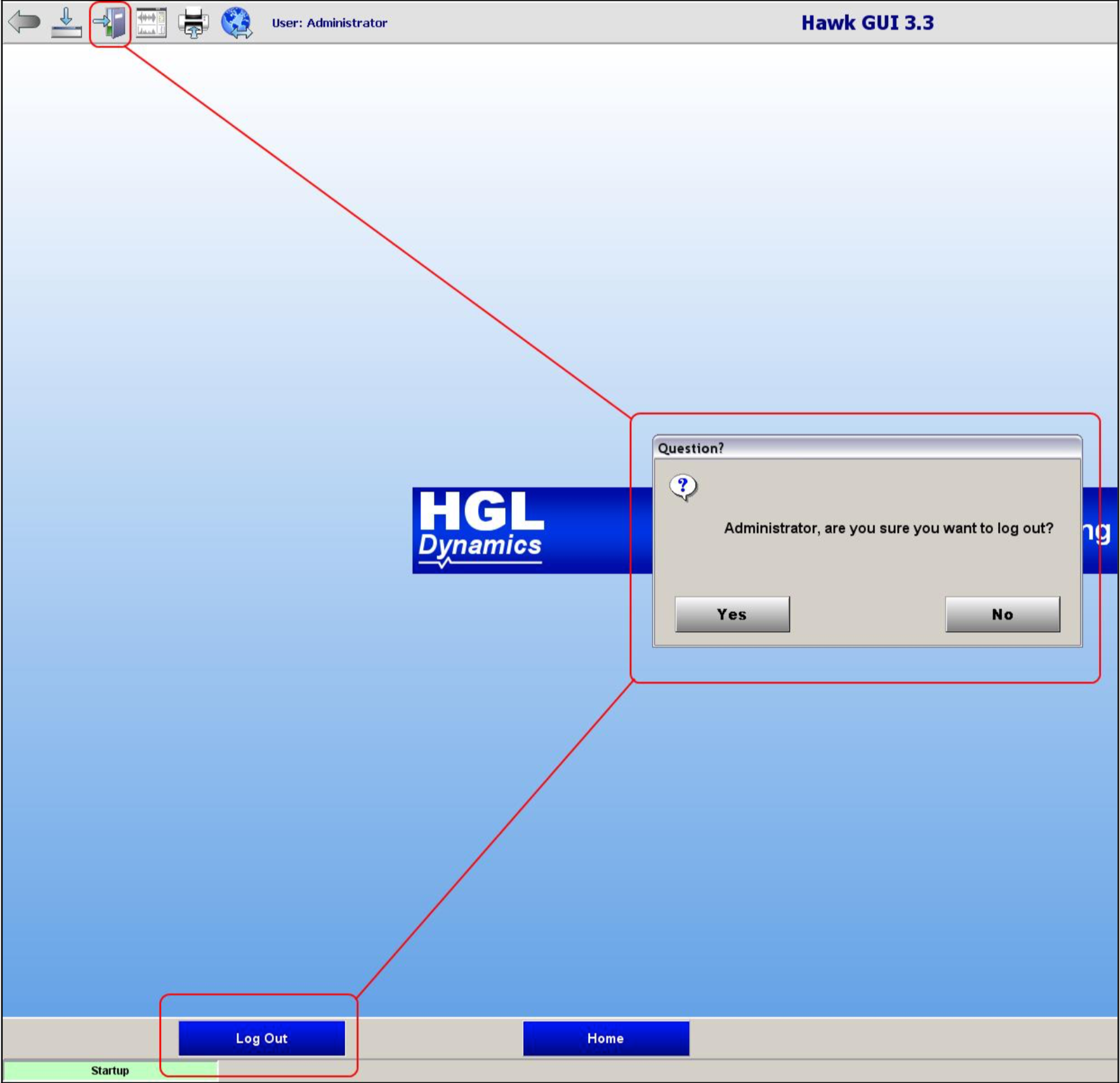If the user is already logged in and has navigated back to the Start-up screen they can Log Out; the GUI will remain on the start-up screen until the next user logs in.