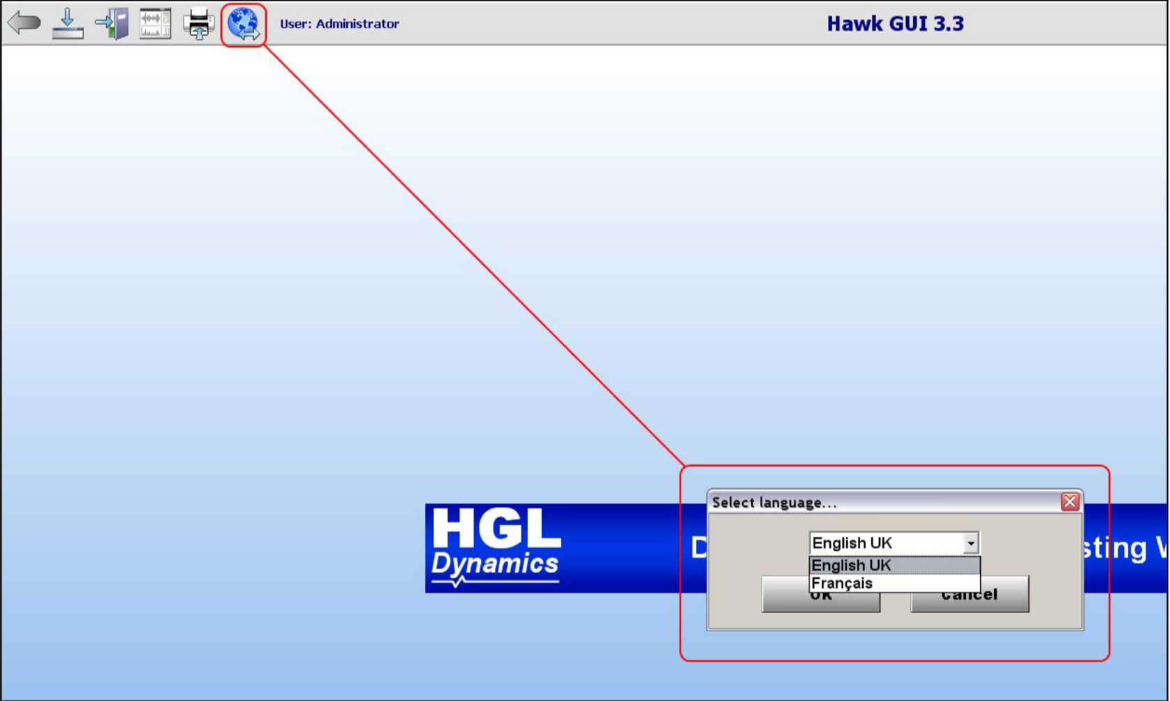 If the user wishes to navigate back to the Home screen then they can press the Home Screen button if they are logged in. The user also has the option to set the language of the GUI from the Start-up screen. This is accessed by clicking the globe at the top of the screen.The final option available from the Start-up screen is to Exit. If the Exit button is pressed the user will be asked if they wish to log out and close the Hawk GUI application.