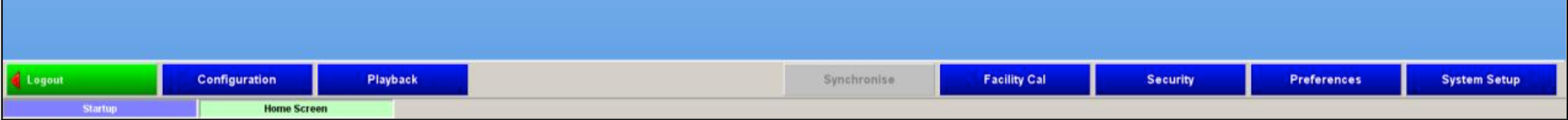 The Home Screen is used to gain access to the other main areas of the GUI, via the buttons on the bottom button panel. These areas are: