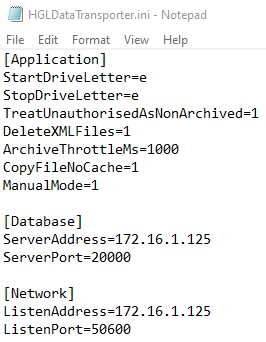 Locate the HGLDataTransporter.ini file in C:\HGL Software\ open the file with notepad to edit its configuration