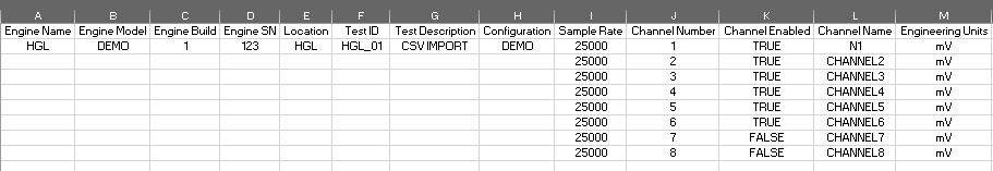 Below is an example of a custom naming format. In this case the software will be looking for the column header 'CSV Example', and will populate the Engine Name field in HawkGUI with the supplied value, which is 'HGL Demo'. When using custom naming formats for column headers, make sure that each one is unique.