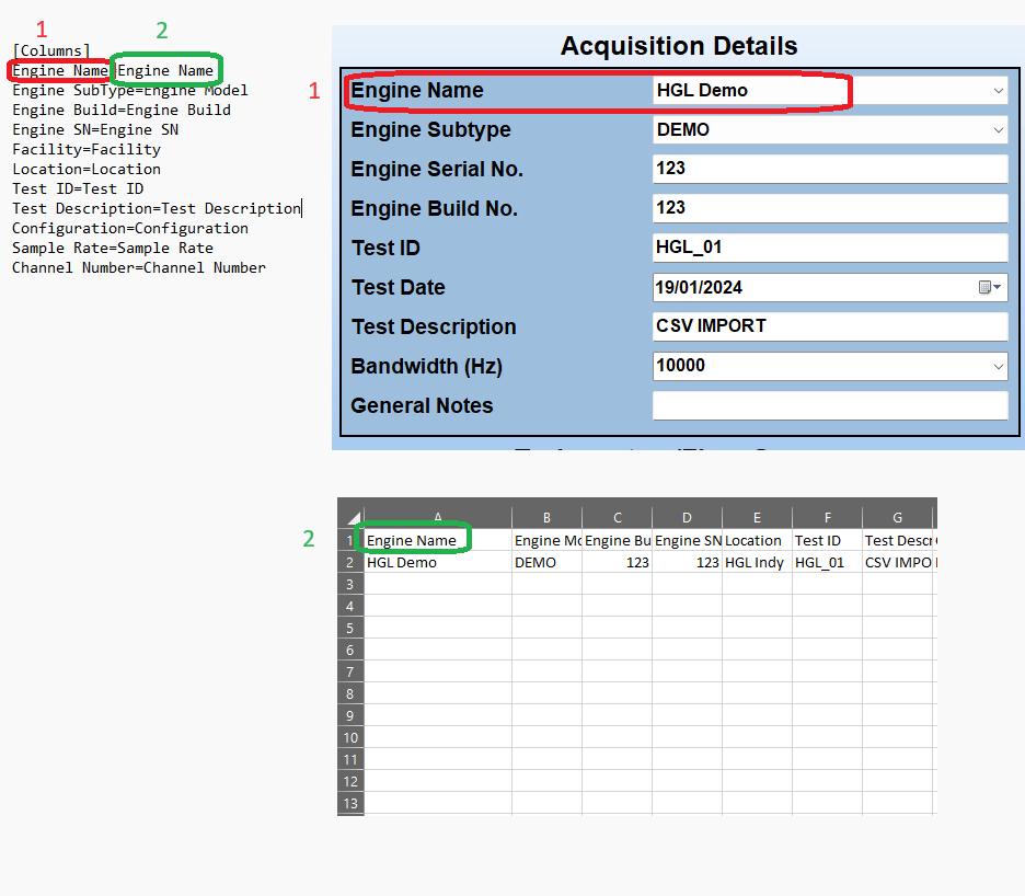 In the figure below, the Engine Name parameter is being used as the example. Inside of the CSVImportMapping.ini file, the 'Engine Name' to the left of the '=', labeled with the red and the number 1, corresponds with a configurable setting in the software. In this case, that is the Engine Name field, located on the Acquisition Configuration screen.