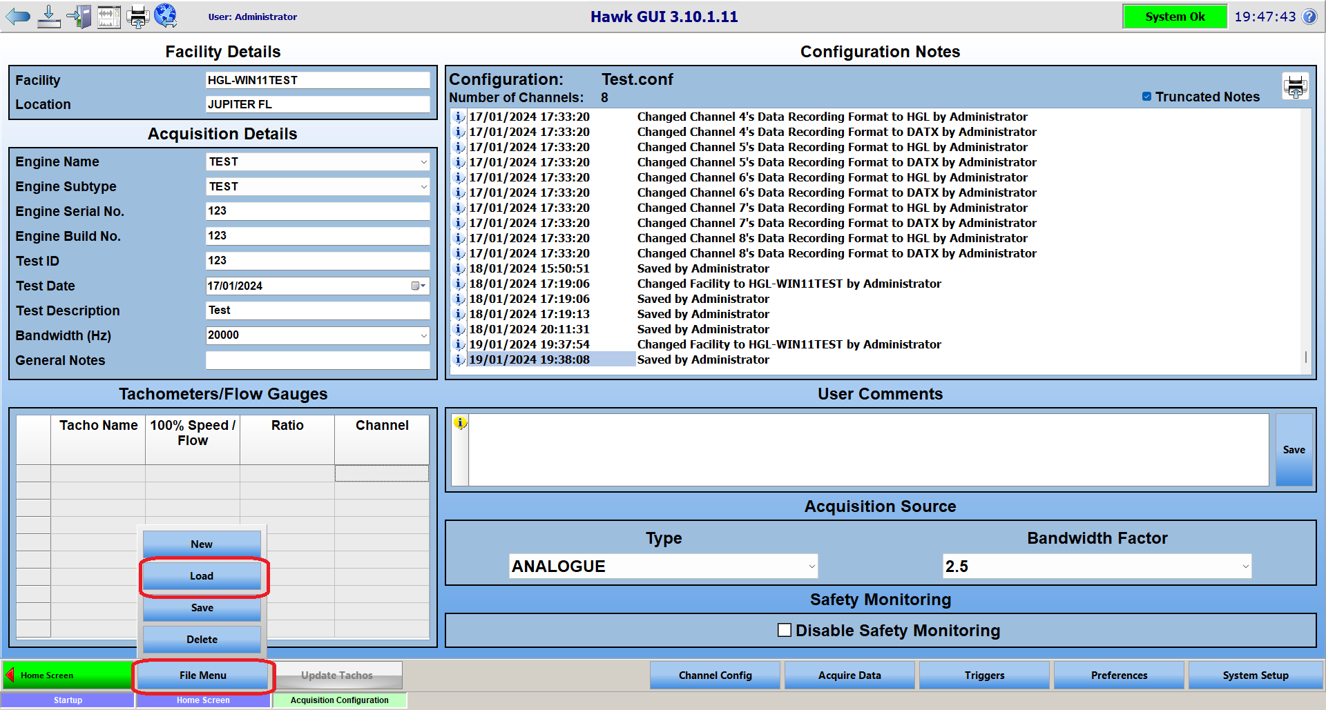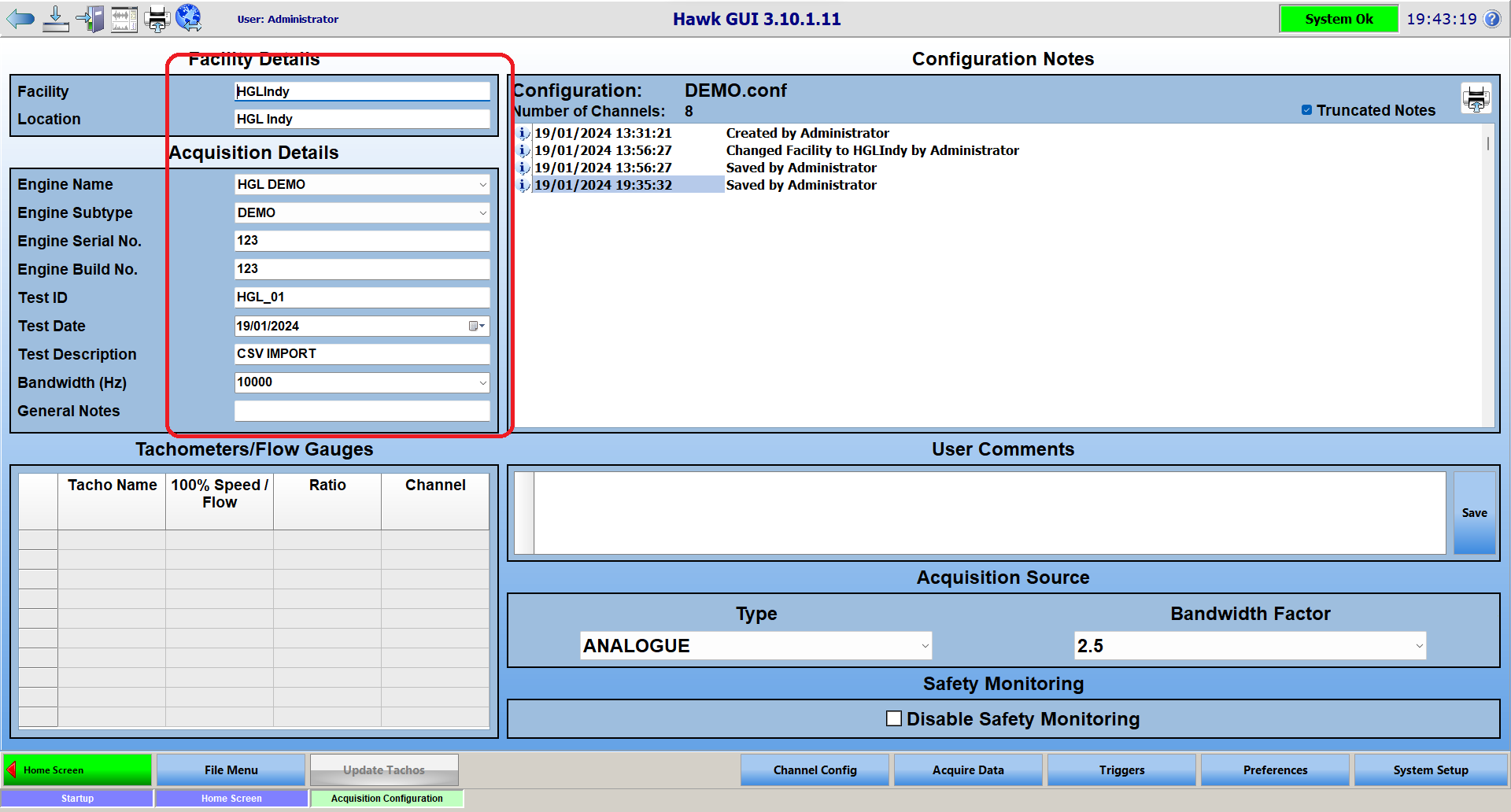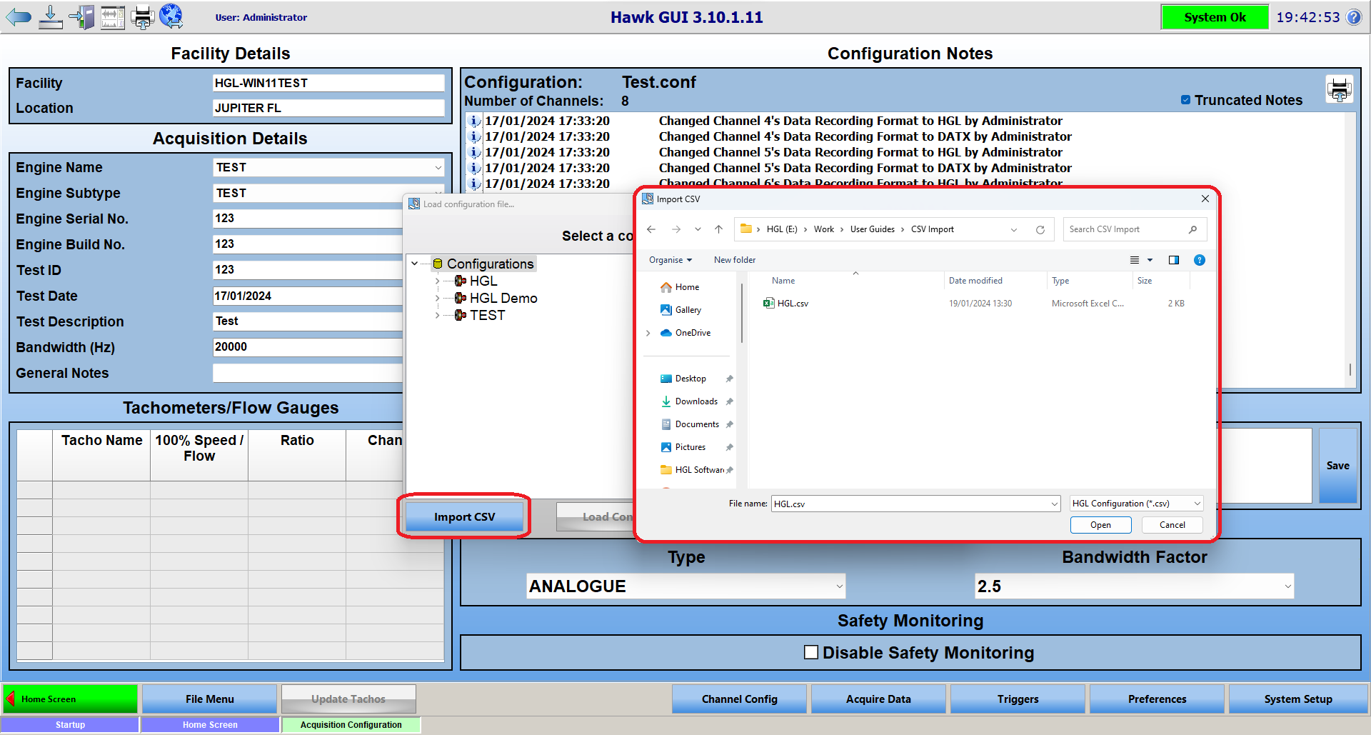 Once you click open, it should populate HawkGUI with the settings found in your CSV file. Once the config has been loaded, it is recommended that you click 'File Menu' and then 'Save'. If you forget to, HawkGUI should prompt you to save the imported configuration prior to leaving the Acquisition Configuration page.