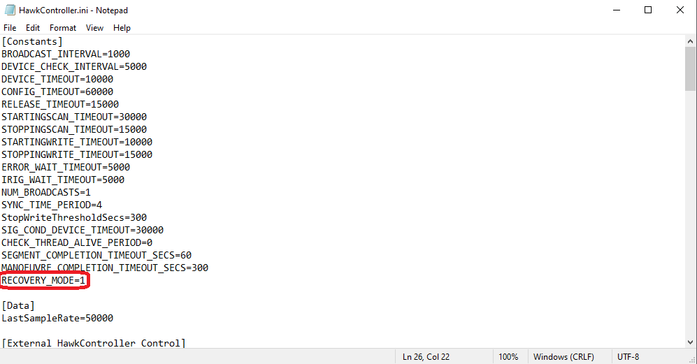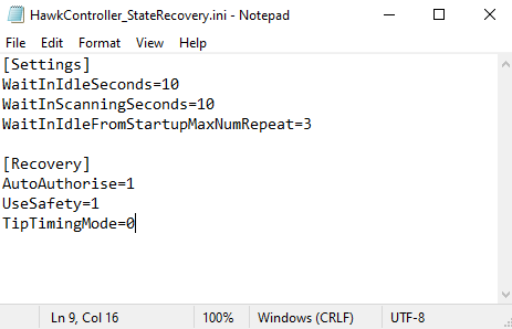 There is a new configuration file named HawkController_StateRecovery.ini. This configuration file contains two segments, Settings and Recovery. The settings allow you to configure a few aspects of Recovery Mode, they are as follows: