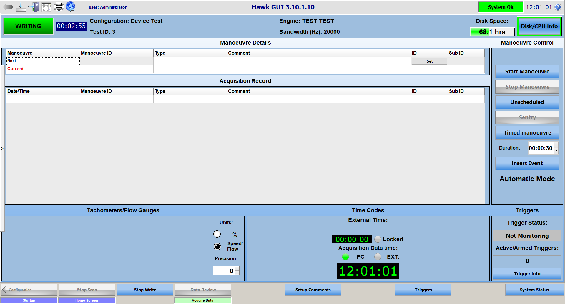 After a few seconds, HawkGUI should return to the acquire data page, with the system back to scanning / writing.