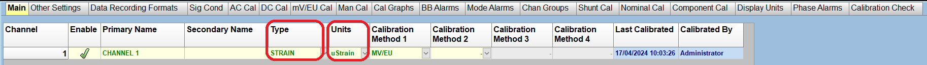 Next, you will need to set the 'Type' to 'STRAIN' in the drop-down menu on the 'Main' tab of your channel configuration. The 'Units' field should automatically change to 'uStrain'.