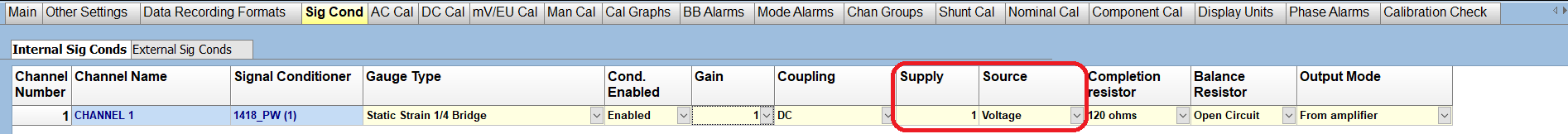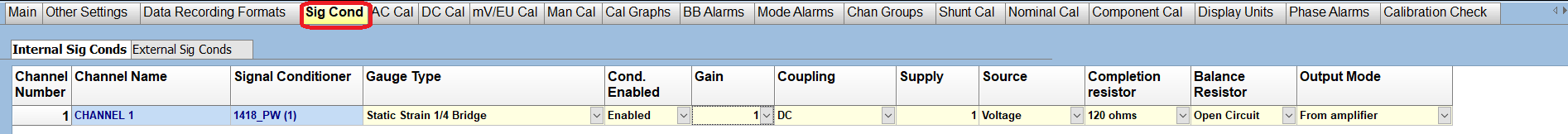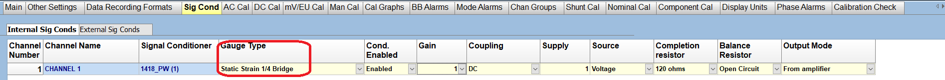After setting your channel type to Strain, some additional configuration needs to be done on the 'Sig Cond' tab which can be found near the top of the page.