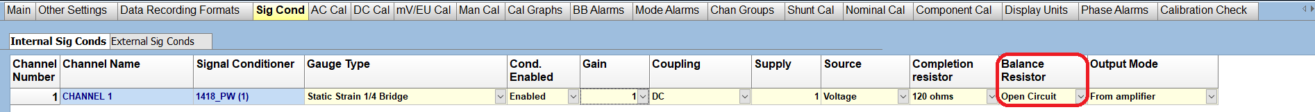 Next, the type of 'Balance Resistor' needs to be selected. The balance resistor is meant to help combat any natural stress in the strain gauge and help balance the bridge circuit while the strain gauge is at rest. The options are 'Open Circuit', 'Fine', and 'Coarse'.