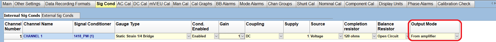 Finally, the 'Output Mode' needs to be configured. This allows you to chose which point in the bridge circuit you are measuring from. The available options are 'From amplifier', 'From integrator', and 'From ground'.