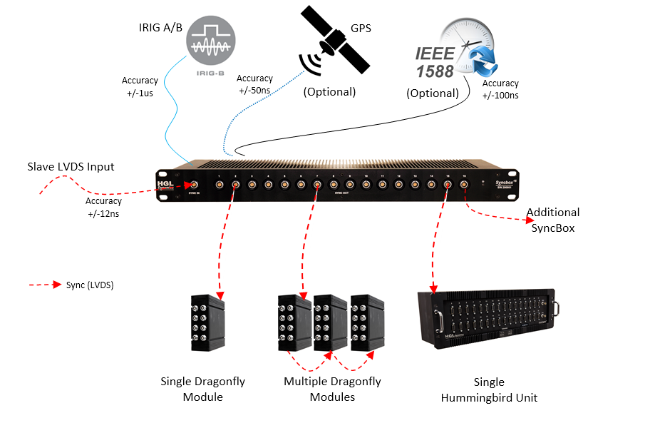 If one or more SyncBox units are used, at least one of them will need to be set as the Master device. Additional SyncBox units should be set to Master if they are using IRIG, GPS, or IEEE1588 external time sources. Otherwise they should be set to Slave and be linked to the master SyncBox via an LVDS link (HGL ACE3 cable).