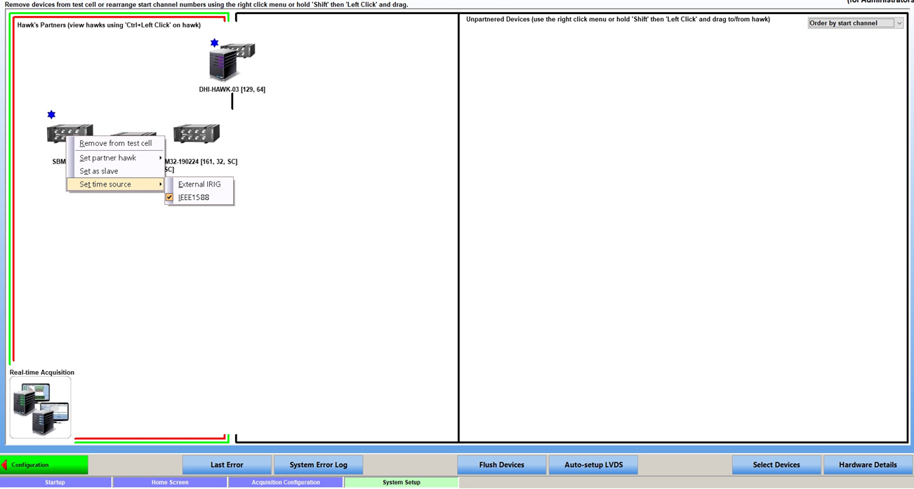 To use a SyncBox it must be added to the Test Cell from within the System Setup Screen (Select Devices). For the first SyncBox unit, it must be set as the Master device and one of the input clock sources should be chosen from the 'Set time source' menu option (as shown below):