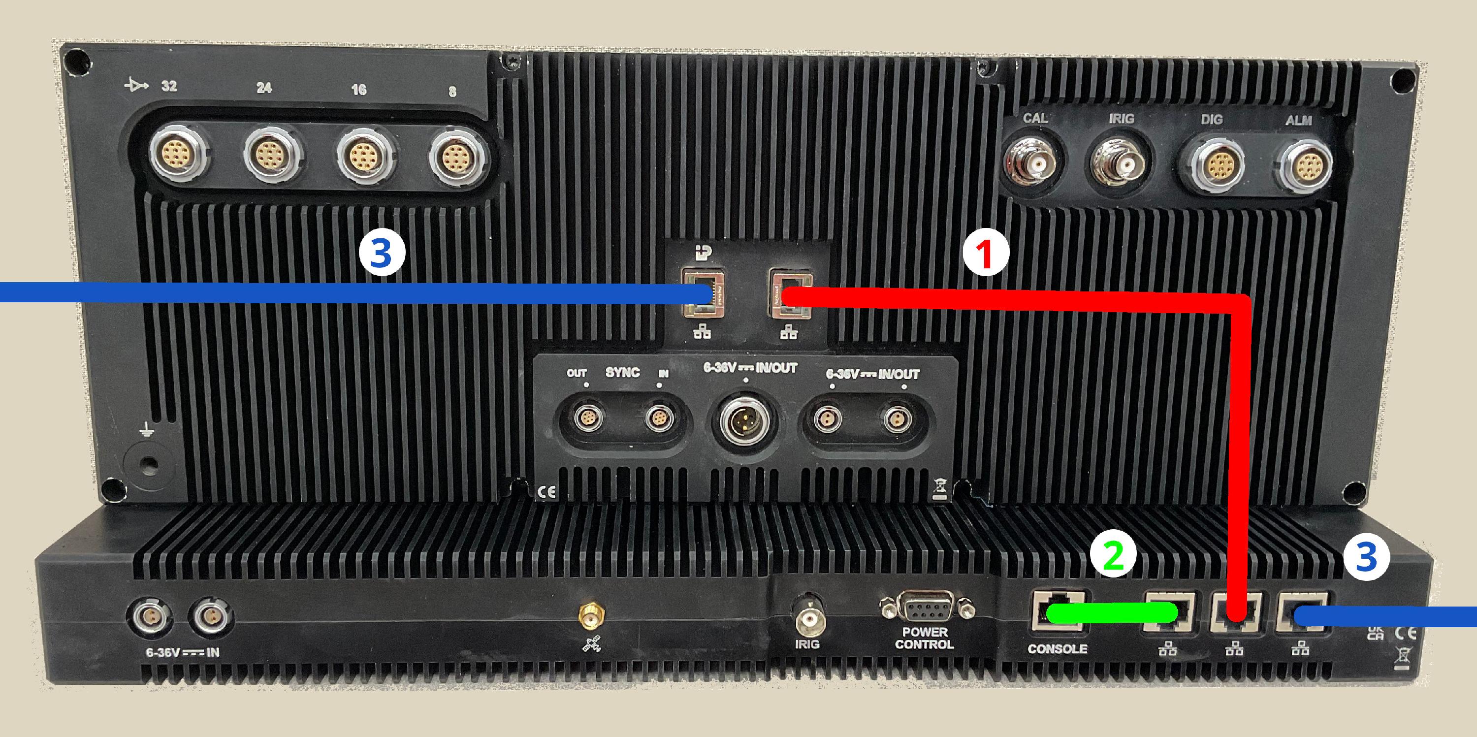 - 1 (Red Line)- This connects the acquisition device (Hummingbird32-1419-CHG pictured) to the built in 3-port network switch on the SyncBox.