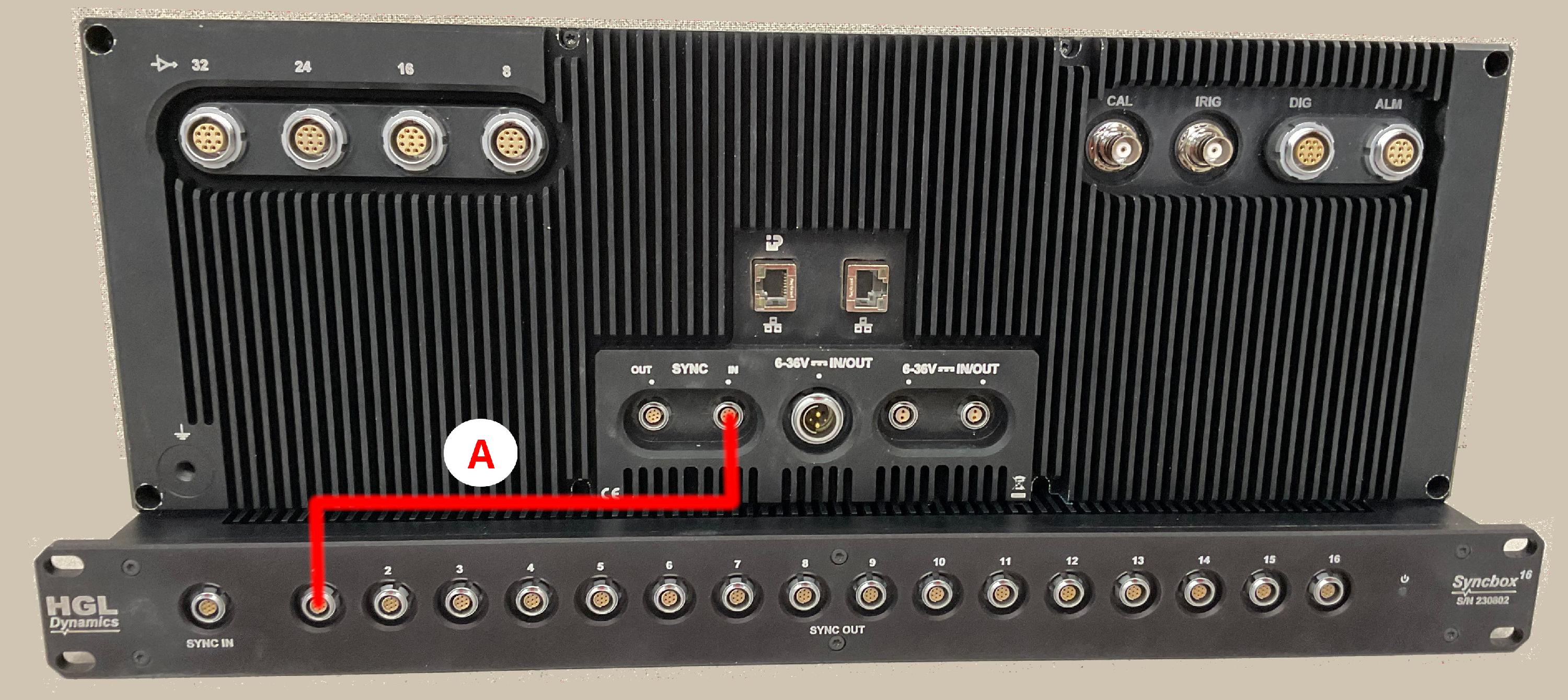 To connect the SyncBox's Sync Out port to the Sync In port on your acquisition device (Hummingbird32-1419-CHG pictured), you will need to use a 7-pin LVDS Sync cable (represented by the red line and A). The LVDS Cable is usually labeled as 'ACE3-(Length in meters)', a batch number should also be listed under the part number.