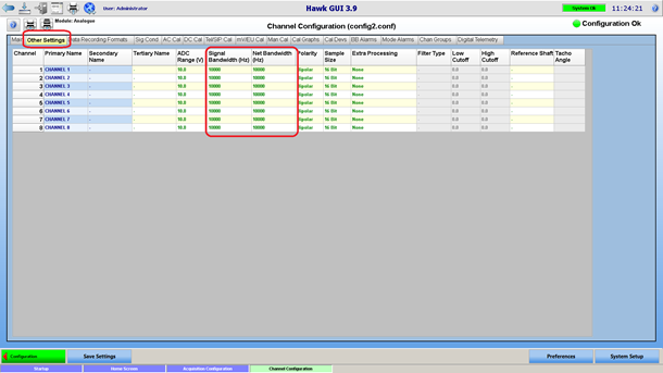 Signal bandwidth defines the sampling rate (sample rate = signal bandwidth * bandwidth factor) of the acquisition card. The sampling rate is the same for all the channels of a given acquisition card, so the signal bandwidth entered will be applied to every other channel belonging to the same acquisition card.