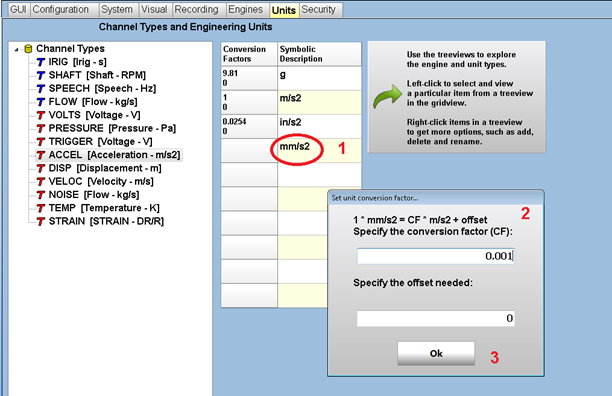 - In the unit conversion panel, specify factor and offset to apply to the base unit, in order to convert to the newly defined unit. This will be used in the real-time screen when the user wishes to see the channel data in a different unit than the channel unit.