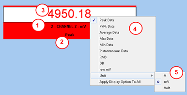 - Mouse right-click popup menu, to change the data being displayed, the units (including dBs), or switch the raw data (to display the value in mV rather than engineering units)
