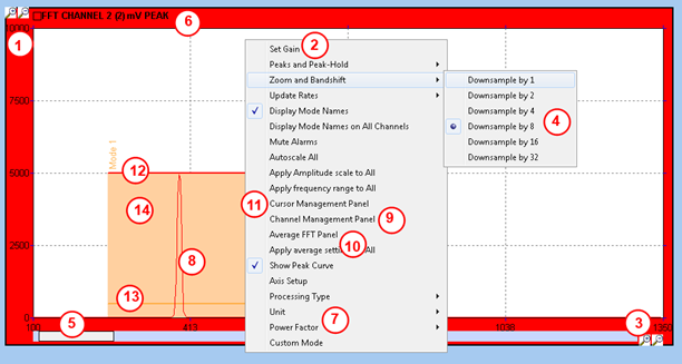 - Frequency zoom options. The downsampling is achieved by the FFT service by applying a low pass filter + decimation on the data, before computing the FFT. Therefore, any other FFT / Campbell plot displaying the same channel will look at the same bandwidth. On the example above, the FFT is currently down-sampled by a factor of 8.
