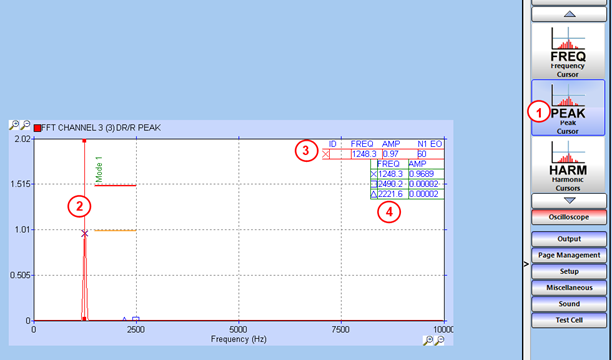 - Click on peak cursor “push button” in the settings panel, in section “FFT cursors”. Then click on the graph to drop the peak cursor at the frequency of choice.