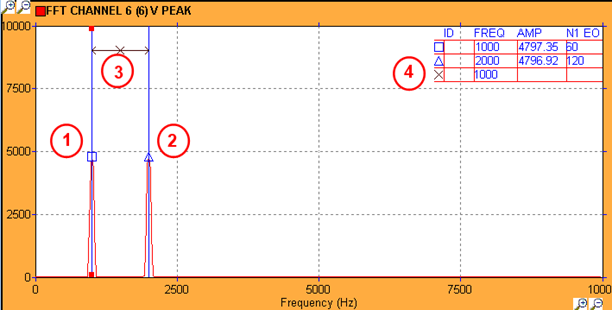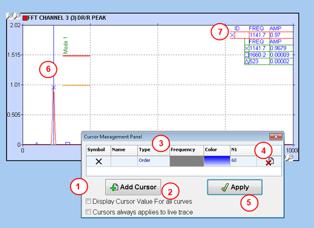 - The cursor table show the cursor symbol, frequency, amplitude, and for each speed channel, the order number and value corresponding to the cursor frequency.