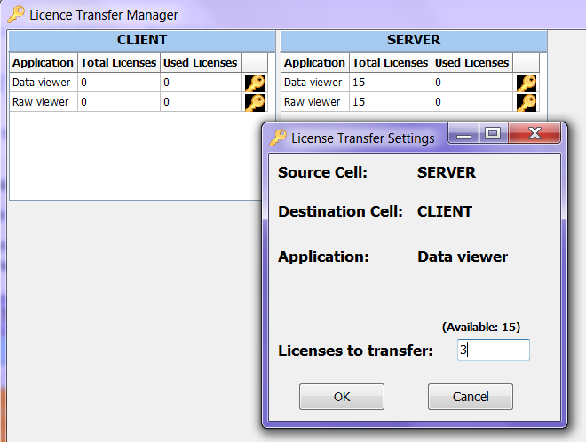 - A pop up box will appear and ask how many licences you would like to transfer. The number of licences a system needs depends on how many Aurora Clients are going to potentially connect to the it at any one time. If the system will be a stand alone laptop with 1 aurora connecting to it then only one licence will be need to be transferred. After selecting the number of licences to transfer select OK.