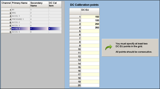 The user must enter between 2 and 20 DC EU values into the grid in the pop-up panel. Each EU will be used to represent a steady-state DC level that is used during calibration.