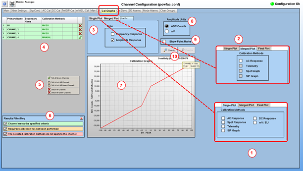 The ‘Cal Graphs’ tab of the Channel Configuration page shows the Calibration Graphs panel. This panel allows the user to view graphs of every channel when at least one calibration method has been performed on that channel. The user can view graphs for the separate calibration methods within a channel, separately, combined, or partially combined.