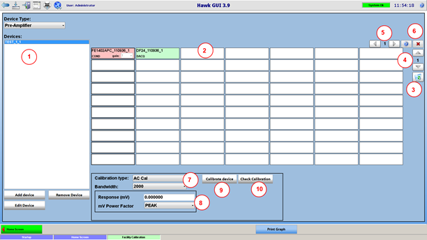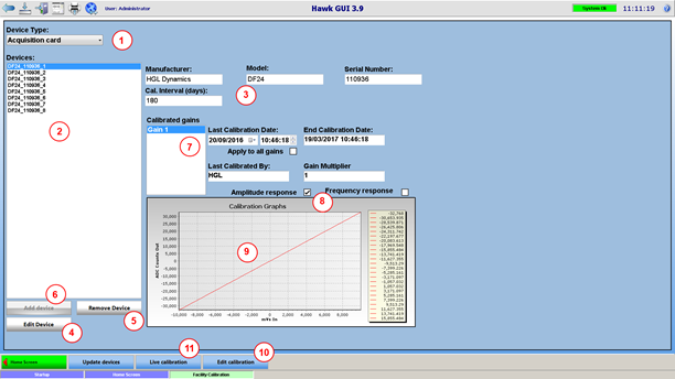 - List of the acquisition cards presents in the system, auto-populated when the user clicked on the “Update devices” button. Select a device to view its details and calibration.