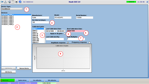 For conditioner devices, user will select which gain to apply during calibration. If the conditioner is the device being calibrated (this is the case in our example), the calibration data computed will be stored against this gain in the database. - Remove a device from a chain by dragging it and dropping it onto the recycle bin.