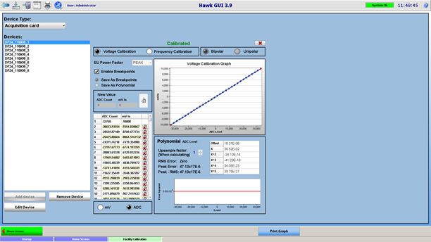 - Graph showing time domain or frequency domain calibration. In our example, the time domain calibration of the acquisition card shows ADC count measured vs voltage on the card input. Note that the default calibration when the device is automatically added will be flat frequency response, and linear 1 mV in 1 mV out amplitude response.